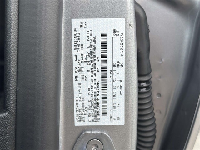 Cold Weather Package (Heated Front Row Seats, Heated Sideview Mirrors, Heated Steering Wheel, and Remote Starter System), Equipment Group 300A, 3.81 Axle Ratio, 4-Wheel Disc Brakes, 6 Speakers, ABS brakes, Air Conditioning, Alloy wheels, AM/FM radio: SiriusXM, AM/FM Stereo, Auto High-beam Headlights, Automatic temperature control, Brake assist, Bumpers: body-color, Compass, Delay-off headlights, Driver door bin, Driver vanity mirror, Dual front impact airbags, Dual front side impact airbags, Electronic Stability Control, Emergency communication system: SYNC 4 911 Assist, Exterior Parking Camera Rear, FordPass Connect, Four wheel independent suspension, Front anti-roll bar, Front Bucket Seats, Front Center Armrest, Front dual zone A/C, Front License Plate Bracket, Front reading lights, Fully automatic headlights, Illuminated entry, Knee airbag, Low tire pressure warning, Occupant sensing airbag, Outside temperature display, Overhead airbag, Overhead console, Panic alarm, Passenger door bin, Passenger vanity mirror, Power door mirrors, Power driver seat, Power Liftgate, Power steering, Power windows, Radio data system, Rear anti-roll bar, Rear reading lights, Rear seat center armrest, Rear window defroster, Rear window wiper, Remote keyless entry, Roof rack: rails only, Speed control, Speed-sensing steering, Speed-Sensitive Wipers, Split folding rear seat, Spoiler, Sport steering wheel, Steering wheel mounted audio controls, SYNC 4, Tachometer, Telescoping steering wheel, Tilt steering wheel, Traction control, Trip computer, Variably intermittent wipers, Vinyl/Cloth Front Sport Contour Bucket Seats, and Wheels: 18" Rock Metallic Painted Aluminum.