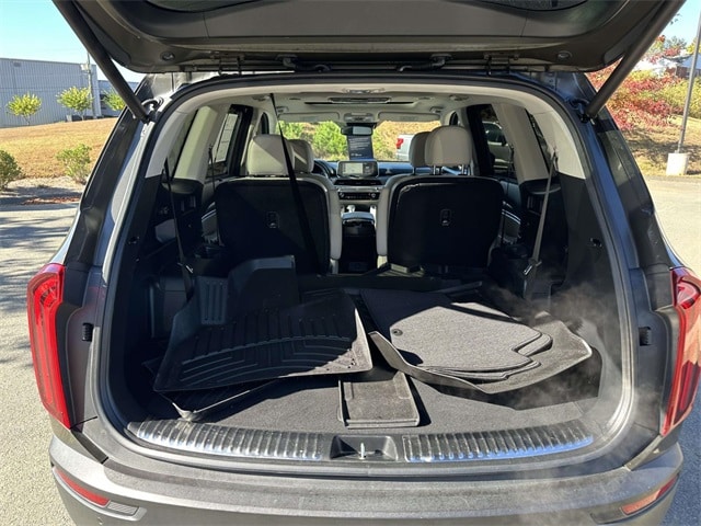 Towing Package (Self-Leveling Rear Suspension and Tow Hitch w/Harness), 10 Speakers, 3.648 Axle Ratio, 3rd row seats: split-bench, 4-Wheel Disc Brakes, ABS brakes, Air Conditioning, Alloy wheels, AM/FM radio: SiriusXM, Apple CarPlay & Android Auto, Auto High-beam Headlights, Auto-dimming Rear-View mirror, Automatic temperature control, Brake assist, Bumpers: body-color, Carpeted Floor Mats, Compass, Delay-off headlights, Driver door bin, Driver vanity mirror, Dual front impact airbags, Dual front side impact airbags, Electronic Stability Control, Emergency communication system: 911 Connect, Four wheel independent suspension, Front anti-roll bar, Front Bucket Seats, Front Center Armrest, Front dual zone A/C, Front fog lights, Front reading lights, Fully automatic headlights, Garage door transmitter: HomeLink, Heated & Ventilated Front Bucket Seats, Heated door mirrors, Heated front seats, Heated Steering Wheel, Heated steering wheel, Illuminated entry, Knee airbag, Leather Shift Knob, Leather steering wheel, Leather-Trimmed Upholstery, Low tire pressure warning, Memory seat, Mud Guard Kit, Navigation System, Occupant sensing airbag, Outside temperature display, Overhead airbag, Overhead console, Panic alarm, Passenger door bin, Passenger vanity mirror, Power door mirrors, Power driver seat, Power Liftgate, Power moonroof, Power passenger seat, Power steering, Power windows, Radio data system, Radio: AM/FM/MP3/SiriusXM Audio System, Rear air conditioning, Rear anti-roll bar, Rear audio controls, Rear reading lights, Rear window defroster, Rear window wiper, Reclining 3rd row seat, Remote keyless entry, Roof rack: rails only, Security system, Speed control, Speed-sensing steering, Split folding rear seat, Spoiler, Steering wheel mounted audio controls, Tachometer, Telescoping steering wheel, Tilt steering wheel, Traction control, Trip computer, Turn signal indicator mirrors, Variably intermittent wipers, Ventilated front seats, and Wheels: 7.5" x 20" Black Finish Sport Alloy.