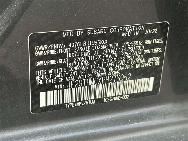 Moonroof Package (Power Moonroof), 4-Wheel Disc Brakes, ABS brakes, Anti-whiplash front head restraints, Auto-Dimming Mirror w/Compass & HomeLink, Dual front impact airbags, Dual front side impact airbags, Emergency communication system: STARLINK Safety and Security (Subscription Required), Front anti-roll bar, Front Bucket Seats, Front Center Armrest, Heated door mirrors, Heated Front Bucket Seats, Heated front seats, Knee airbag, Leather-Trimmed Upholstery, Low tire pressure warning, Occupant sensing airbag, Overhead airbag, Power door mirrors, Power driver seat, Power steering, Power windows, Radio: Subaru STARLINK 8.0" Multimedia Plus System, Rear anti-roll bar, Remote keyless entry, Split folding rear seat, Steering wheel mounted audio controls, 3.70 Axle Ratio, 6 Speakers, Aero Crossbar Set, Air Conditioning, Alloy wheels, AM/FM radio: SiriusXM, Auto High-beam Headlights, Auto-Dimming Exterior Mirror w/Approach Light, Automatic temperature control, Brake assist, Bumpers: body-color, Cargo Net, CD player, Driver door bin, Driver vanity mirror, Electronic Stability Control, Exterior Parking Camera Rear, Four wheel independent suspension, Front fog lights, Front reading lights, Fully automatic headlights, Illuminated entry, Outside temperature display, Overhead console, Panic alarm, Passenger door bin, Passenger vanity mirror, Radio data system, Rear seat center armrest, Rear Seatback Protector, Rear window defroster, Rear window wiper, Security system, Speed control, Speed-sensing steering, Spoiler, STARLINK/Apple CarPlay/Android Auto, Tachometer, Telescoping steering wheel, Tilt steering wheel, Traction control, Trip computer, Turn signal indicator mirrors, Variably intermittent wipers, and Wheels: 18" x 7.0J Alum Alloy Blk w/Machine Finish.