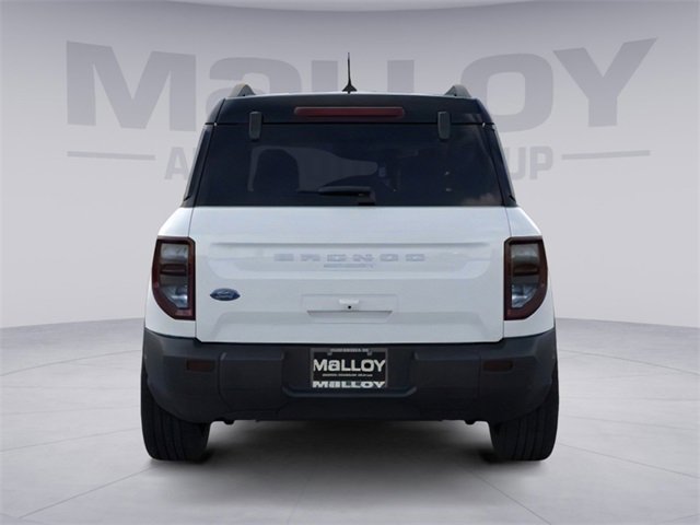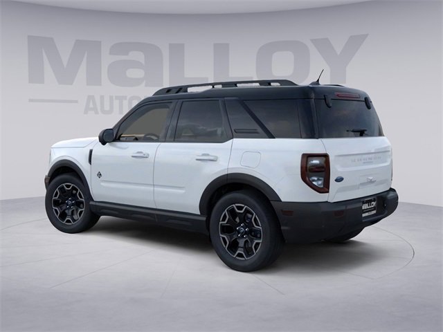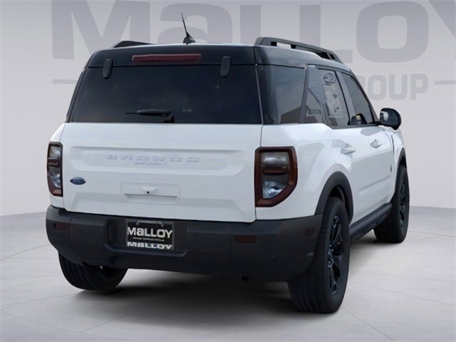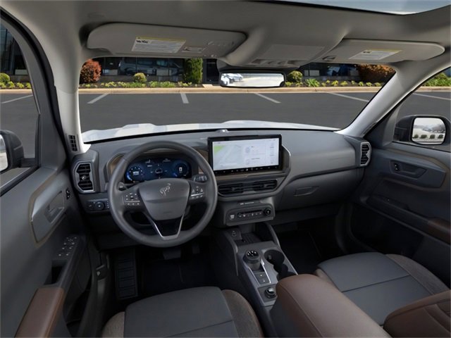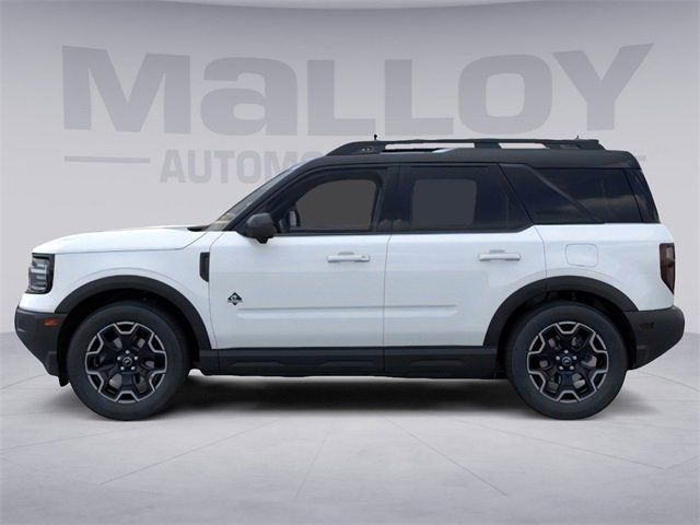 Equipment Group 300A, Outer Banks Tech Package+ (B&O Sound System by Bang & Olufsen, Connected Navigation, and HD Radio), 360-Degree Camera w/Trail & Split View, 4-Wheel Disc Brakes, 6 Speakers, ABS brakes, Air Conditioning, Alloy wheels, AM/FM radio: SiriusXM, AM/FM Stereo, Auto High-beam Headlights, Auto-dimming Rear-View mirror, Automatic temperature control, Brake assist, Compass, Delay-off headlights, Driver door bin, Driver vanity mirror, Dual front impact airbags, Dual front side impact airbags, Electronic Stability Control, Emergency communication system: SYNC 4 911 Assist, Four wheel independent suspension, Front anti-roll bar, Front Bucket Seats, Front Center Armrest, Front Driver/Passenger Seat Back Map Pockets, Front dual zone A/C, Front fog lights, Front License Plate Bracket, Front Parking Sensors, Front reading lights, Fully automatic headlights, Garage door transmitter, Heated door mirrors, Heated front seats, Heated steering wheel, Illuminated entry, Knee airbag, Low tire pressure warning, Memory seat, Occupant sensing airbag, Outside temperature display, Overhead airbag, Overhead console, Panic alarm, Passenger door bin, Passenger vanity mirror, Power door mirrors, Power driver seat, Power Moonroof, Power passenger seat, Power steering, Power windows, Premium Trimmed Front Bucket Seats w/Ebony/Roast, Radio data system, Rain sensing wipers, Rear anti-roll bar, Rear Parking Sensors, Rear reading lights, Rear seat center armrest, Rear window defroster, Rear window wiper, Remote keyless entry, Reverse Brake Assist, Security system, SiriusXM, Speed control, Speed-sensing steering, Speed-Sensitive Wipers, Split folding rear seat, Steering wheel mounted audio controls, SYNC 4 w/Enhanced Voice Recognition, Tachometer, Telescoping steering wheel, Tilt steering wheel, Traction control, Trip computer, Variably intermittent wipers, and Wheels: 18" Ebony Black-Painted Aluminum. 2025 Ford Bronco Sport 1.5L EcoBoost Oxford White