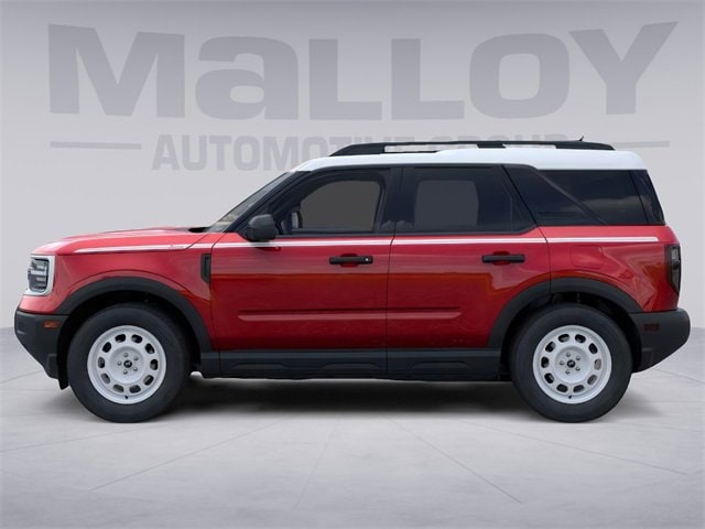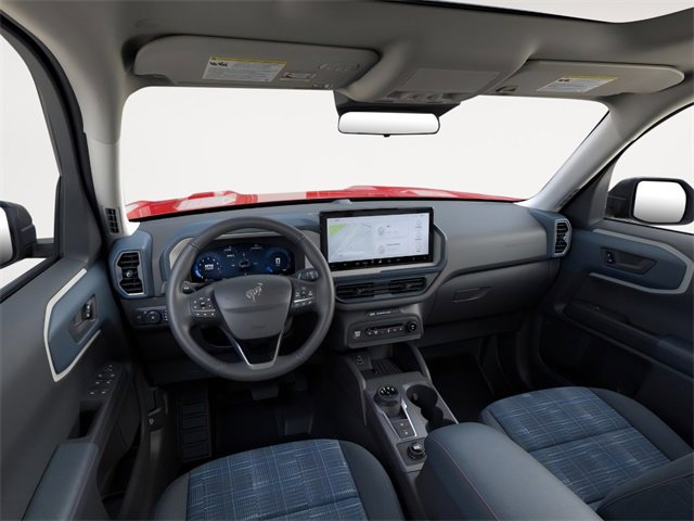 Convenience Package (Front Driver/Passenger Seat Back Map Pockets, Heated 8-Way Power Driver's Seat, LED Fog Lamps, Premium Wrapped Steering Wheel, and Universal Garage Door Opener (UGDO)), Equipment Group 250A, 4-Wheel Disc Brakes, 6 Speakers, ABS brakes, Air Conditioning, Alloy wheels, AM/FM radio: SiriusXM, AM/FM Stereo, Auto High-beam Headlights, Automatic temperature control, Brake assist, Compass, Delay-off headlights, Driver door bin, Driver vanity mirror, Dual front impact airbags, Dual front side impact airbags, Electronic Stability Control, Emergency communication system: SYNC 4 911 Assist, Four wheel independent suspension, Front anti-roll bar, Front Bucket Seats, Front Center Armrest, Front License Plate Bracket, Front reading lights, Fully automatic headlights, Heated door mirrors, Illuminated entry, Knee airbag, Low tire pressure warning, Occupant sensing airbag, Outside temperature display, Overhead airbag, Overhead console, Panic alarm, Passenger door bin, Passenger vanity mirror, Plaid Cloth Front Bucket Seats, Power door mirrors, Power Moonroof, Power steering, Power windows, Radio data system, Rear anti-roll bar, Rear Parking Sensors, Rear reading lights, Rear seat center armrest, Rear window defroster, Rear window wiper, Remote keyless entry, Security system, SiriusXM, Speed control, Speed-sensing steering, Speed-Sensitive Wipers, Split folding rear seat, Steering wheel mounted audio controls, SYNC 4 w/Enhanced Voice Recognition, Tachometer, Telescoping steering wheel, Tilt steering wheel, Traction control, Trip computer, Variably intermittent wipers, and Wheels: 17" Oxford White-Painted Aluminum. 2025 Ford Bronco Sport 1.5L EcoBoost Ruby Red Metallic Tinted Clearcoat