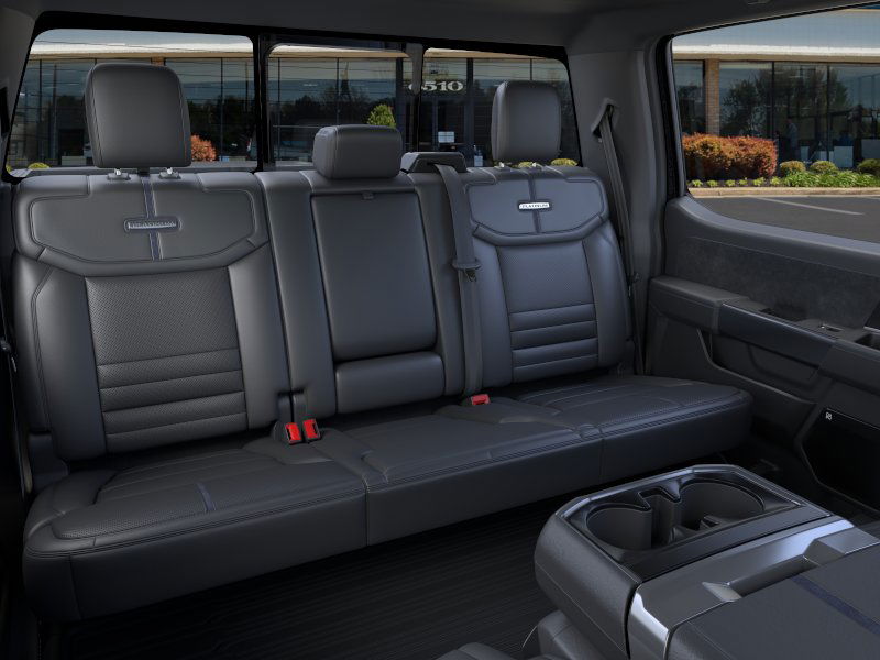 Equipment Group 702A High (Heads-Up Display, Radio: B&O Unleashed Sound System by Bang & Olufsen, and Twin Panel Moonroof), FX4 Off-Road Package (4x4 FX4 Off-Road Bodyside Decal, Hill Descent Control, Monotube Rear Shocks, Off-Road Tuned Front Shock Absorbers, and Rock Crawl Mode), 4-Wheel Disc Brakes, 8 Speakers, ABS brakes, Adjustable pedals, Air Conditioning, Alloy wheels, AM/FM radio: SiriusXM with 360L, Auto High-beam Headlights, Auto tilt-away steering wheel, Auto-dimming door mirrors, Auto-dimming Rear-View mirror, Automatic temperature control, Brake assist, Bumpers: body-color, Compass, Delay-off headlights, Driver door bin, Driver vanity mirror, Dual front impact airbags, Dual front side impact airbags, Electronic Stability Control, Emergency communication system: SYNC 4 911 Assist, Front anti-roll bar, Front Bucket Seats, Front Center Armrest, Front dual zone A/C, Front fog lights, Front License Plate Bracket, Front reading lights, Front wheel independent suspension, Fully automatic headlights, Garage door transmitter, Heated door mirrors, Heated front seats, Heated rear seats, Heated steering wheel, Illuminated entry, Internet access capable: FordPass Connect 5G, Leather steering wheel, Low tire pressure warning, Memory seat, Navigation system: Connected Navigation, Occupant sensing airbag, Outside temperature display, Overhead airbag, Overhead console, Panic alarm, Passenger door bin, Passenger vanity mirror, Pedal memory, Power door mirrors, Power driver seat, Power passenger seat, Power steering, Power windows, Radio data system, Radio: B&O Sound System by Bang & Olufsen, Rain sensing wipers, Rear reading lights, Rear seat center armrest, Rear step bumper, Rear window defroster, Remote keyless entry, Security system, Speed control, Split folding rear seat, Steering wheel memory, Steering wheel mounted audio controls, SYNC 4 w/Enhanced Voice Recognition, Tachometer, Telescoping steering wheel, Tilt steering wheel, Tough Bed Spray-In Bedliner, Traction control, Tray Style Floor Liner, Trip computer, Turn signal indicator mirrors, Unique Multi-Contour Leather Bucket Seats, Variably intermittent wipers, Ventilated front seats, Voltmeter, and Wheels: 20" Painted Gloss Ebony Black. 2025 Ford F-150 3.5L PowerBoost Full-Hybrid V6 Agate Black Metallic