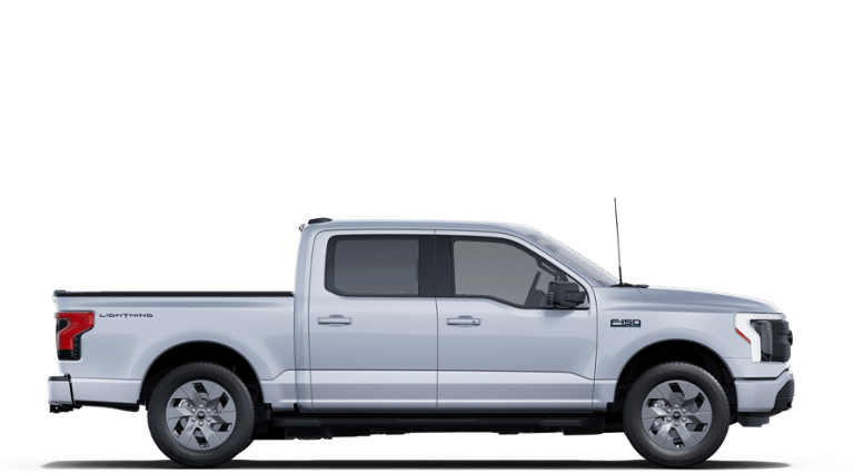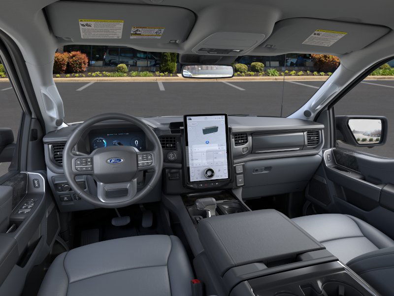 Equipment Group 312A Standard, 4-Wheel Disc Brakes, 8 Speakers, ABS brakes, ActiveX Trimmed Heated Front Seats, Adjustable pedals, Air Conditioning, Alloy wheels, Auto High-beam Headlights, Auto-dimming Rear-View mirror, Automatic temperature control, Brake assist, Bumpers: body-color, Compass, Delay-off headlights, Driver door bin, Driver vanity mirror, Dual front impact airbags, Dual front side impact airbags, Electronic Stability Control, Emergency communication system: SYNC 4 911 Assist, Four wheel independent suspension, Front anti-roll bar, Front Bucket Seats, Front Center Armrest, Front dual zone A/C, Front License Plate Bracket, Front reading lights, Fully automatic headlights, Heated door mirrors, Heated front seats, Heated steering wheel, Illuminated entry, Knee airbag, Low tire pressure warning, Mobile Power Cord (120/240V), Navigation system: Connected Navigation, Occupant sensing airbag, Outside temperature display, Overhead airbag, Overhead console, Panic alarm, Passenger door bin, Passenger vanity mirror, Power door mirrors, Power driver seat, Power passenger seat, Power steering, Power windows, Radio data system, Radio: B&O Sound System by Bang & Olufsen, Rear anti-roll bar, Rear reading lights, Rear step bumper, Rear window defroster, Remote keyless entry, Security system, Speed control, Speed-sensing steering, Split folding rear seat, Steering wheel mounted audio controls, SYNC 4A w/Enhanced Voice Recognition, Telescoping steering wheel, Tilt steering wheel, Traction control, Trip computer, Turn signal indicator mirrors, Variably intermittent wipers, and Wheels: 20" Alloy Dark Carbonized Gray. 2025 Ford F-150 Lightning Electric Motor Space White Metallic