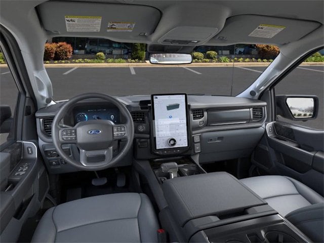 Equipment Group 312A Standard, 4-Wheel Disc Brakes, 8 Speakers, ABS brakes, ActiveX Trimmed Heated Front Seats, Adjustable pedals, Air Conditioning, Alloy wheels, Auto High-beam Headlights, Auto-dimming Rear-View mirror, Automatic temperature control, Brake assist, Bumpers: body-color, Compass, Delay-off headlights, Driver door bin, Driver vanity mirror, Dual front impact airbags, Dual front side impact airbags, Electronic Stability Control, Emergency communication system: SYNC 4 911 Assist, Four wheel independent suspension, Front anti-roll bar, Front Bucket Seats, Front Center Armrest, Front dual zone A/C, Front License Plate Bracket, Front reading lights, Fully automatic headlights, Heated door mirrors, Heated front seats, Heated steering wheel, Illuminated entry, Knee airbag, Low tire pressure warning, Mobile Power Cord (120/240V), Navigation system: Connected Navigation, Occupant sensing airbag, Outside temperature display, Overhead airbag, Overhead console, Panic alarm, Passenger door bin, Passenger vanity mirror, Power door mirrors, Power driver seat, Power passenger seat, Power steering, Power windows, Radio data system, Radio: B&O Sound System by Bang & Olufsen, Rear anti-roll bar, Rear reading lights, Rear step bumper, Rear window defroster, Remote keyless entry, Security system, Speed control, Speed-sensing steering, Split folding rear seat, Steering wheel mounted audio controls, SYNC 4A w/Enhanced Voice Recognition, Telescoping steering wheel, Tilt steering wheel, Traction control, Trip computer, Turn signal indicator mirrors, Variably intermittent wipers, and Wheels: 20" Alloy Dark Carbonized Gray. 2025 Ford F-150 Lightning Electric Motor Oxford White