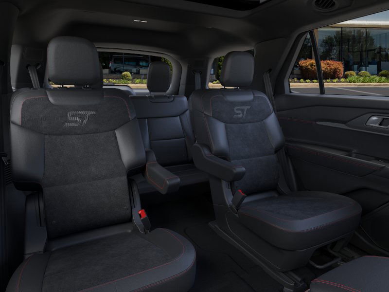 10 Speakers, 3rd row seats: bench, 4-Wheel Disc Brakes, ABS brakes, Air Conditioning, Alloy wheels, AM/FM radio: SiriusXM with 360L, Apple CarPlay/Android Auto, Auto High-beam Headlights, Auto-dimming door mirrors, Auto-dimming Rear-View mirror, Automatic temperature control, Brake assist, Bumpers: body-color, Compass, Delay-off headlights, Driver door bin, Driver vanity mirror, Dual front impact airbags, Dual front side impact airbags, Electronic Stability Control, Emergency communication system: 911 Assist, Exterior Parking Camera Rear, Four wheel independent suspension, Front anti-roll bar, Front Bucket Seats, Front Center Armrest, Front dual zone A/C, Front fog lights, Front reading lights, Fully automatic headlights, Garage door transmitter, Heated door mirrors, Heated front seats, Heated rear seats, Heated steering wheel, Heated/Ventilated Miko Suede Captain's Chairs, Illuminated entry, Knee airbag, Leather steering wheel, Low tire pressure warning, Memory seat, Navigation System, Occupant sensing airbag, Outside temperature display, Overhead airbag, Overhead console, Panic alarm, Passenger door bin, Passenger vanity mirror, Power door mirrors, Power driver seat, Power Liftgate, Power passenger seat, Power steering, Power windows, Radio: B&O Sound System by Bang and Olufsen, Rain sensing wipers, Rear air conditioning, Rear anti-roll bar, Rear reading lights, Rear window defroster, Rear window wiper, Remote keyless entry, Security system, Speed control, Speed-sensing steering, Speed-Sensitive Wipers, Split folding rear seat, Spoiler, Sport steering wheel, Steering wheel mounted audio controls, Tachometer, Telescoping steering wheel, Tilt steering wheel, Traction control, Trip computer, Turn signal indicator mirrors, Variably intermittent wipers, Ventilated front seats, and Wheels: 21" Magnetite-Painted Aluminum. Recent Arrival! 2026 Ford Explorer 3.0L EcoBoost V6 Agate Black Metallic