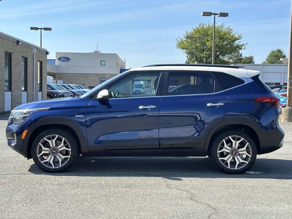 2021 SELTOS TURBO SX AWD, APPLE CARPLAY AND ANDROID CAPABLE, UVO LINK NAVIGATION, SMART CRUISE CONTROL, REAR VIEW CAMERA , ALL WHEEL DRIVE, POWER DRIVER SEAT WITH ADJUSTABLE LUMBAR, REMOTE START , SMART KEY AND SO MUCH MORE PLEASE CONTACT ONE OF OUR CERTIFIED PRE OWNED SALES ADVISORS FORC OMPLETE DETAILSDark Ocean Blue/White Roof 2021 Kia Seltos SX AWD 7-Speed Automatic I418 Alloy Wheels, 4-Wheel Disc Brakes, 4.643 Axle Ratio, 8 Speakers, ABS brakes, Air Conditioning, Alloy wheels, AM/FM radio: SiriusXM, Apple CarPlay & Android Auto, Auto-dimming Rear-View mirror, Automatic temperature control, Brake assist, Bumpers: body-color, Carpeted Floor Mats, Delay-off headlights, Driver door bin, Driver vanity mirror, Dual front impact airbags, Dual front side impact airbags, Electronic Stability Control, Emergency communication system, Exterior Parking Camera Rear, Four wheel independent suspension, Front anti-roll bar, Front Bucket Seats, Front Center Armrest, Front fog lights, Front reading lights, Fully automatic headlights, Heated door mirrors, Heated Front Bucket Seats, Heated front seats, Illuminated entry, Leather Seat Trim, Leather Shift Knob, Low tire pressure warning, Navigation System, Occupant sensing airbag, Outside temperature display, Overhead airbag, Overhead console, Panic alarm, Passenger door bin, Passenger vanity mirror, Power door mirrors, Power driver seat, Power steering, Power windows, Radio: AM/FM/MP3 Display Audio, Rear seat center armrest, Rear window defroster, Rear window wiper, Remote keyless entry, Security system, Smart Key w/ Push Button and Remote Start, Speed control, Speed-sensing steering, Split folding rear seat, Spoiler, Steering wheel mounted audio controls, Tachometer, Telescoping steering wheel, Tilt steering wheel, Traction control, Trip computer, Turn signal indicator mirrors, and Variably intermittent wipers. Recent Arrival! 25/30 City/Highway MPG