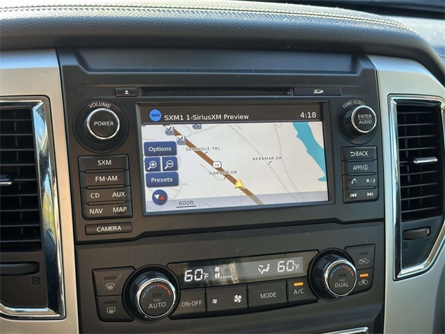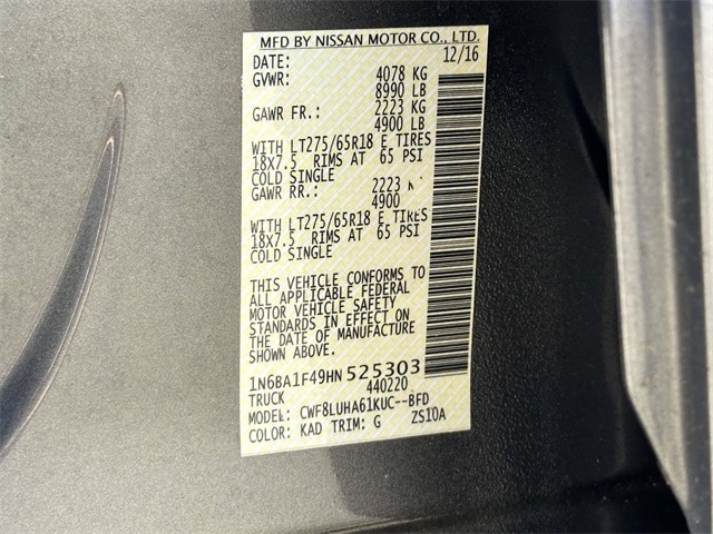 PRO-4X Utility & Audio Package (Electronic Locking Tailgate, Rear Utility Bed Step, and Rockford Fosgate Premium Audio w/12 Speakers), 3.916 Axle Ratio, 4-Wheel Disc Brakes, 6 Speaker System, 6 Speakers, ABS brakes, Air Conditioning, Alloy wheels, AM/FM radio: SiriusXM, Automatic temperature control, Block heater, Brake assist, CD player, Delay-off headlights, Driver door bin, Driver vanity mirror, Dual front impact airbags, Dual front side impact airbags, Electronic Stability Control, Front anti-roll bar, Front Bucket Seats, Front Captain's Chairs, Front Center Armrest, Front dual zone A/C, Front fog lights, Front reading lights, Front wheel independent suspension, Heated door mirrors, Illuminated entry, Leather steering wheel, Low tire pressure warning, Navigation System, Occupant sensing airbag, Outside temperature display, Overhead airbag, Overhead console, Panic alarm, Passenger door bin, Passenger vanity mirror, Power door mirrors, Power driver seat, Power steering, Power windows, Radio data system, Radio: NissanConnect w/SiriusXM/Navi & Mobile Apps, Rain sensing wipers, Rear anti-roll bar, Rear seat center armrest, Rear step bumper, Rear window defroster, Remote keyless entry, Security system, Speed control, Speed-sensing steering, Speed-Sensitive Wipers, Splash Guards w/Overfenders, Split folding rear seat, Stain Resistant Cloth Seat Trim w/Vinyl Bolsters, Steering wheel mounted audio controls, Tachometer, Telescoping steering wheel, Tilt steering wheel, Traction control, Turn signal indicator mirrors, Variably intermittent wipers, Voltmeter, and Wheels: 18" x 7.5" Dark Painted Finish Alloy.