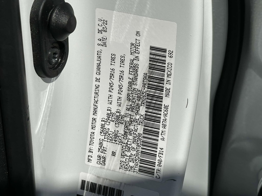 White 2022 Toyota Tacoma SR RWD 6-Speed Automatic 2.7L SMPI DOHC All Weather Floor Liner & Door Sill Protector (TMS), Apple CarPlay/Android Auto, Exterior Parking Camera Rear, Power steering, Power windows, Remote Keyless Entry, SR Convenience Package, Steering wheel mounted audio controls.